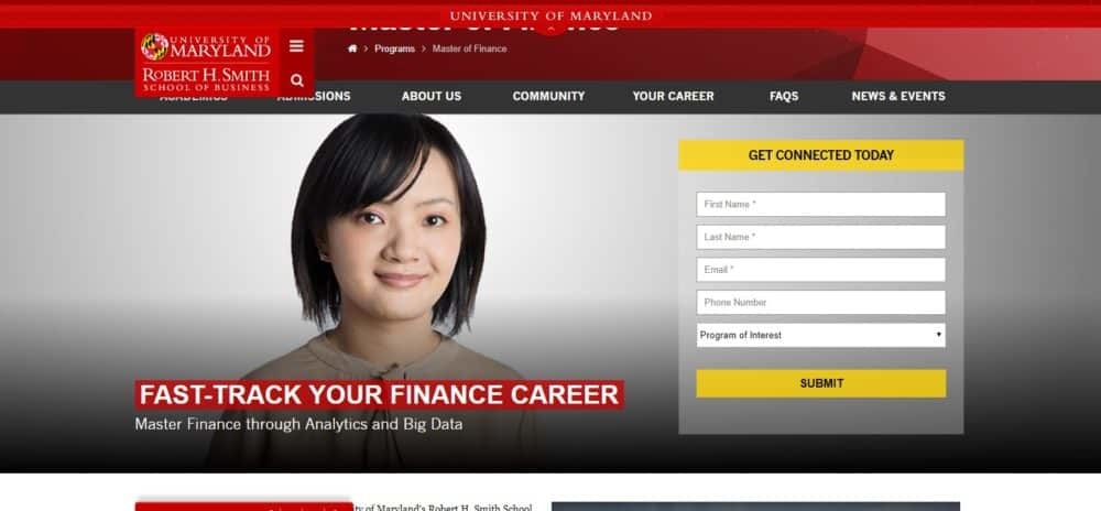 The Master of Finance program at the University of Maryland's Robert H. Smith School of Business will introduce you to some of the top minds in finance today. The program is taught by a faculty that is among the top ranked in the nation, and who also serve as consultants to Fortune 500 companies, multinational corporations, and government agencies. The school’s professors are also eminent scholars who are regularly awarded for their research, teaching and other achievements. Students in this program gain skills that will set you apart in an increasingly competitive job market. Students will develop a specialization within a business discipline that will equip them to pursue an ideal career or advance in their current field, in as few as nine months. The program features a comprehensive curriculum that prepares you adequately for tough and rewarding career options in the finance industry. Students are required to study 12 credits of core finance courses and an additional 18 credits of finance electives that align with their interests and career targets. These courses are tailored to help students attain competence in using the latest tools in corporate finance, asset management, risk management, and valuation. To achieve this, students participate in Center for Financial Policy events and get industry-specific career coaching, as well as receive tremendous preparation for the CFA exam. There are also other opportunities for students to enhance their finance education including experiential learning projects and case competitions where they can apply their learned knowledge in real-world applications. Another benefit of this program is that you study in a campus just outside the capital of the United States, Washington, D.C, a city that has been listed as one of the best places to live in America by this year’s U.S. News & World Report this year. And even better; you can complete the degree in one or two years.
