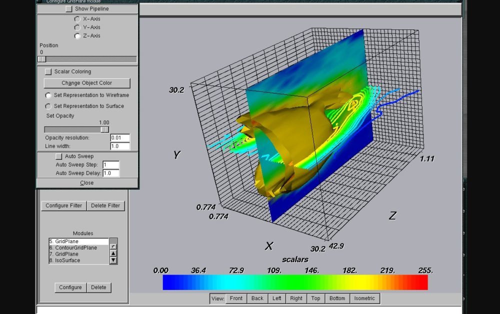 It visualizes data using texture and raycast mappers and supports any VTK dataset using VTK data format. It has a modular design enabling the user to add their modules and filters while supporting the importation of a simple 3D Studio Scene or VRML. However texturing in VRML is not yet supported. MayaVi also has a look up table to customize lookups for easy data visualization. It is also possible to save visualized data for future use.