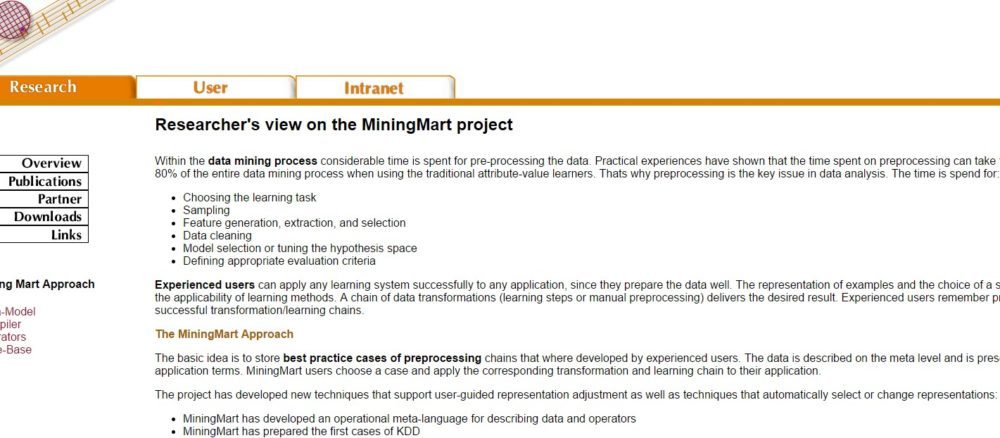 The main goal is to support users in making intelligent choices by offering following objectives: Operators for preprocessing with direct database access; Use of machine learning for the preprocessing; Detailed documentation of successful cases; High quality discovery results; Scalability to very large databases and Techniques that automatically select or change representations. MiningMart’s basic idea is to store best practice cases of preprocessing chains that where developed by experienced users.