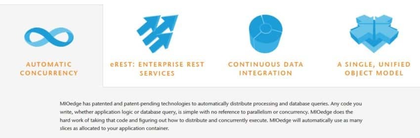 MIOedge technologies to automatically distribute processing and database queries. Any code you write, whether application logic or database query, is simple with no reference to parallelism or concurrency. MIOedge does the hard work of taking that code and figuring out how to distribute and concurrently execute. MIOedge will automatically use as many slices as allocated to your application container.