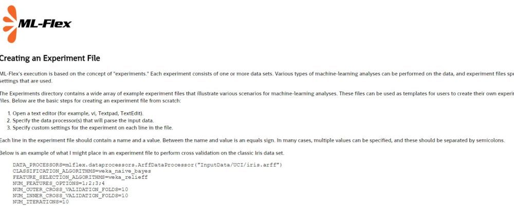 ML-Flex is an open-source software package designed to enable flexible and efficient processing of disparate data sets for machine-learning analyses. The algorithms are extracted from elements with the purpose of predicting the values of a conditional variable. The “ant” build tool can be preinstalled or downloaded working with earlier or later versions of Java. ML-Flex can execute machine-learning algorithms included in the Weka data-mining software as well as Orange machine-learning framework, C5.0 Decision Trees software, and R statistical package. The software can be applied across multiple systems with similar functionality also available using the Network File System protocol on UNIX-based systems or a shared network drive on Windows. ML-Flex can carry out any given computing node, with the ability to retrieve and store files accessible to connect to other nodes. ML-Flex’s performance is based on the theory of experiments comprising one or more data sets. The ML-Flex directory contains examples of experiment files to illustrate various possibilities of machine-learning analyses with files that can be used as templates.