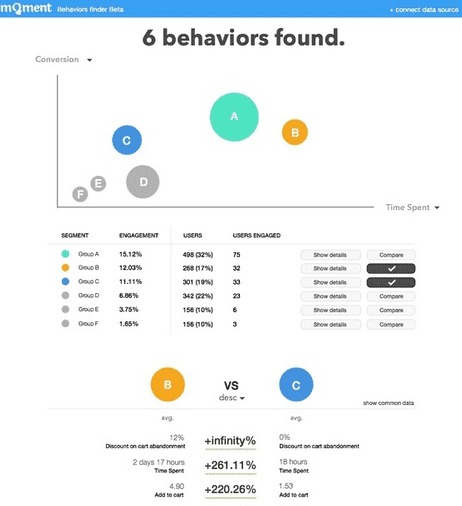 mQment uses clustering algorithm on analytics data from Google Analytics or others sources. Once the groups are found, you can compare them in an intuitive way.