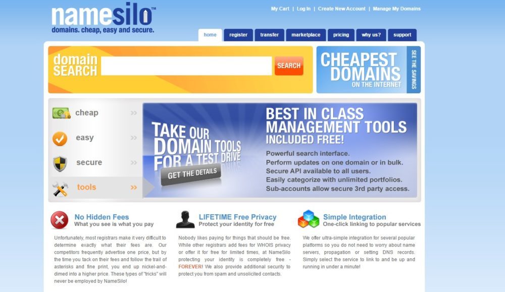 NameSilo.com has built its site with ease-of-use in mind. The registration, transfer and renewal processes are quick and easy without the bombardment of service up sell offers synonymous with most other registrars. On the other hand, its domain manager allows users to organize and search for their domains based upon multiple criteria.