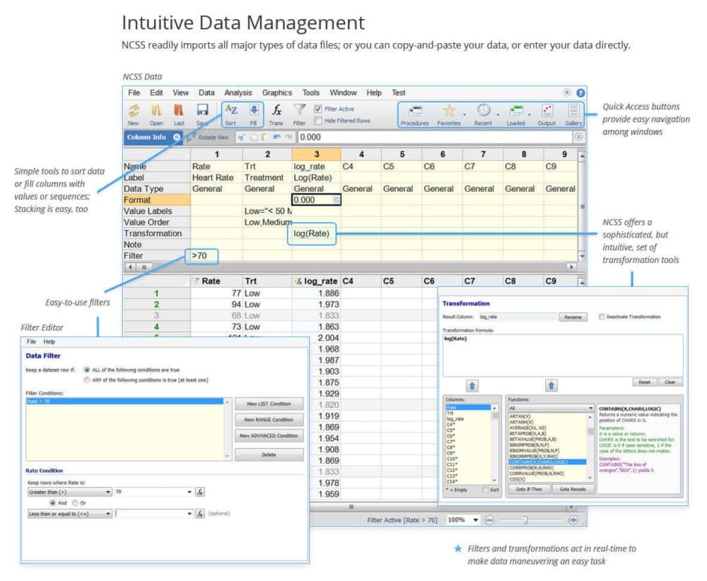NCSS has excellent filtering and transformation features for managing your data. Finding the right analysis or graphics procedure is easy using the drop-down menu, the procedure search, or the category tree.The analysis and graphics tools are easy to use and have built-in help messages for every option.