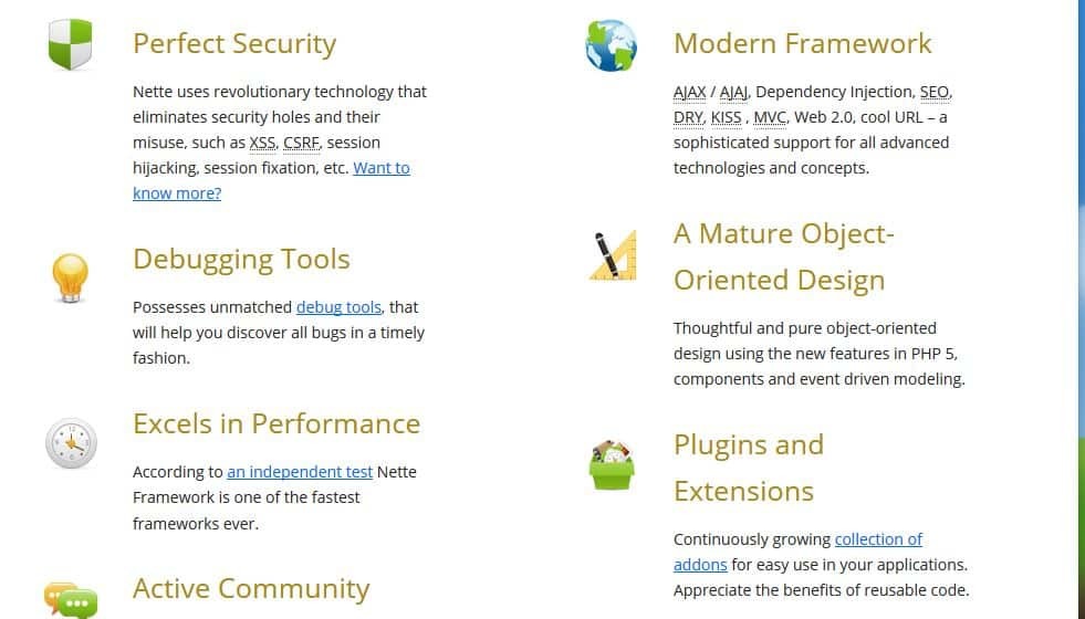 Nette uses revolutionary technology that eliminates security holes and their misuse, such as XSS, CSRF, session hijacking, session fixation, etc. Nette Framework will lead to well designed applications with emphasis on future extensibility. Nette Framework does not limit the developer.