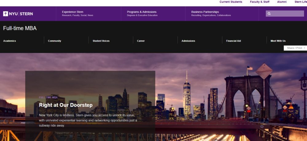 The New York University, Leonard N. Stern School of Business’ Full-Time MBA integrates innovative academic theory with hands-on, experiential learning opportunities to develop competent business leaders. The full-time MBA required core consists of the following two courses; Financial Accounting & Reporting, and Statistics & Data Analysis. Students are also required to choose at least five core courses from the following list; Firms & Markets, Foundations of Finance, The Global Economy, Leadership in Organizations, Marketing, Operations Management, and Strategy. After completing their first year, students are advised to participate in a robust campus recruiting program or attend a summer internship in companies throughout the world. In the second year, students can customize the curriculum through electives and specializations. You can select up to three specializations whose electives can be chosen from the available 200+ electives. You can take up to 5 elective courses at other NYU graduate schools. Stern’s MBA students are given numerous opportunities to tackle real world issues in real time through Stern Solutions experiential learning opportunities. Students can participate in a Doing Business In (DBi) course in over 10 locations worldwide, which gives them a chance to use their business skills to solve real world problems across diverse industries. You can also choose to spend a semester studying abroad in a leading overseas graduate business school at one of Stern's 53 exchange partners in 29 different countries. As an MBA student, you can take advantage of personalized leadership development opportunities that will support your growth as a leader who creates value for business and society.