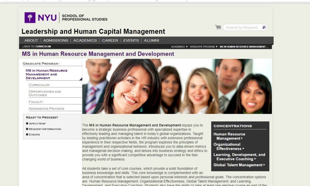 The New York University’s MS in Human Resource Management and Development program equips you with the expertise to manage talent, both in local and global organizations, in a professional way. The program is taught by experienced practitioner-scholars in the HR industry and explores the principles of management and organizational behavior. It introduces you to data-driven metrics and managerial decision making, and instills business strategy and ethics in you, so you gain a competitive advantage in today’s the fast-changing world of business. All students take a set of core courses, which provide a solid foundation of business knowledge and skills. One can choose an area of concentration based upon personal interests and professional goals. The concentration options are: Human Resource Management; Organizational Effectiveness; Global Talent Management; and Learning, Development, and Executive Coaching. Students also take at least one elective course as part of the program. There is also a mandatory capstone experience which allows students to put into practice the knowledge they have acquired either through a special project course or by completing a thesis. The degree may be completed online, on campus, or through a combination of both. The duration of the course is about two years when you study full-time. You can also study part-time through evening and weekend classes, which will take you about five years to complete the program. Part-time study is a plus for senior managers and executives as well as recent college graduates as it offers maximum flexibility for their busy schedules.