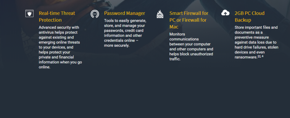 Password Manager tools help quickly generate, store, and manage users passwords, credit card information and other credentials online – more securely. Smart Firewall for PC or Firewall for Mac monitors communications between the user's computer and other computers and helps block unauthorized traffic. 2GB PC Cloud Backup stores essential files and documents as a preventive measure against data loss due to hard drive failures, stolen devices and even ransomware.