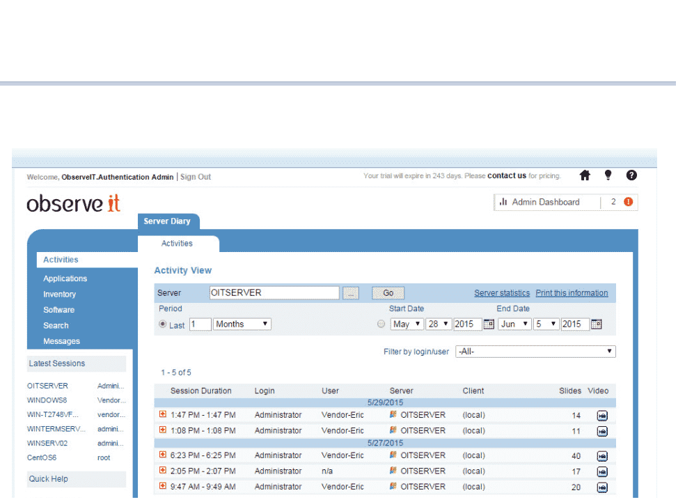 ObserveIT monitors and records all user activity on Windows and Unix/Linux servers and desktops. Playing back a user session shows exactly what occurred on screen during the session - reducing investigations to under 10 minutes per incident.ObserveIT provides screen-recording technology to capture all user activity regardless of the environment.