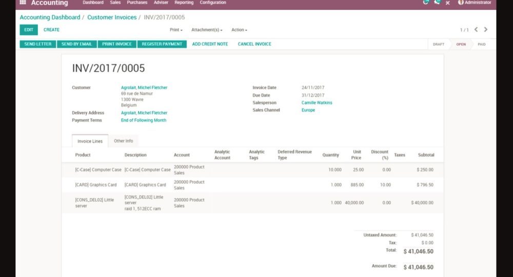 Odoo Invoicing helps manage contracts, create recurring invoices, bill timesheets and get paid faster. Use the status overview to help keep track of drafts, paid and unpaid invoices.