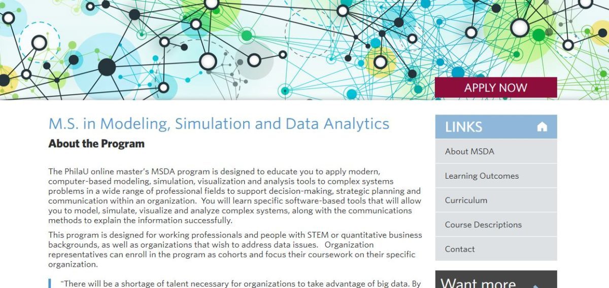 Philadelphia University offers online program M.S. in Modeling, Simulation and Data Analytics. The PhilaU online master’s MSDA program is designed to educate you to apply modern, computer-based modeling, simulation, visualization and analysis tools to complex systems problems in a wide range of professional fields to support decision-making, strategic planning and communication within an organization.