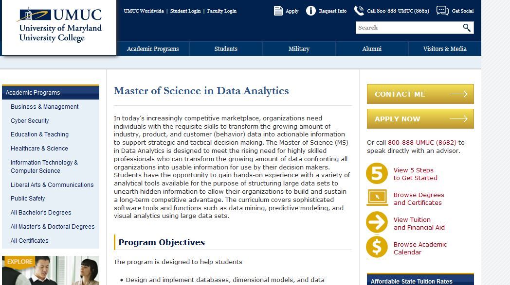 University of Maryland, Master of Science (MS) in Data Analytics is designed to meet the rising need for highly skilled professionals who can transform the growing amount of data confronting all organizations into usable information for use by their decision makers.Students have the opportunity to gain hands-on experience with a variety of analytical tools available for the purpose of structuring large data sets to unearth hidden information to allow their organizations to build and sustain a long-term competitive advantage. The curriculum covers sophisticated software tools and functions such as data mining, predictive modeling, and visual analytics using large data sets.