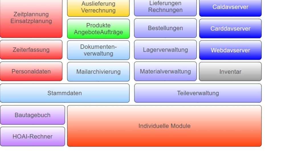 The Open Source ERP is a web based ERP which contains a web interface for administration of the system and an active directory based on Samba resp., a groupware based on Sogo. The Open Source ERP offers features such as active directory, groupware Sogo, system administration, customer management (CRM), order management, delivery management, warehouse management, inventory management, personnel management, work time recording, work time planning, document repository with version control, webdav, webcal, webcard, mail archiving, customizable and HOAI. The Open Source ERP can be used as SBS for sharing data via Webdav and SMB and administrate website based on Apache. The Open Source ERP server software runs on Linux, MAC OS X and Windows.