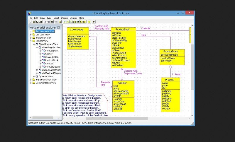 Prosa UML modeler has been carefully thought out to assist the software designer to understand the software requirements, architecture and functionality, and make the design choices and decisions be communicated and understood by others. The modeler supports use case, sequence, collaboration, class, state chart, activity, component, deployment and package diagrams. Prosa provides the natural path from sequence diagram/object collaboration diagram analysis to class diagram design. The objects and messages identified in sequence analysis are automatically transferred to classes and their operations in class diagram. The clear model integration of Prosa connects the classes and state chart diagrams as defined in…