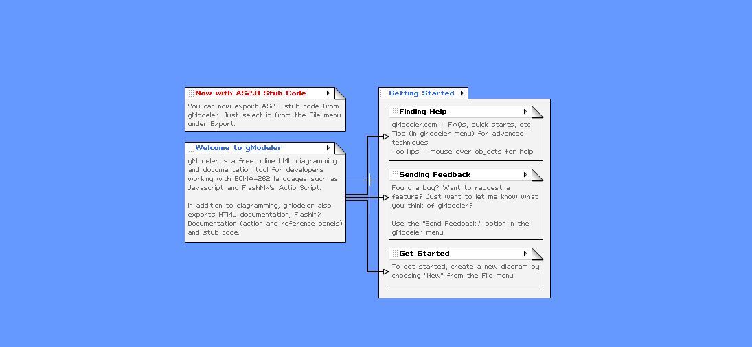 gModeler is a free online UML diagramming and documentation tool, targetted at developers working with ECMA 262 languages such as FlashMX's Actionscript, and Javascript. In addition to its diagramming capabilities, it exports HTML documentation, FlashMX XML documentation (for the Action Panel and Reference Panel) and stub code (class code). gModeler Supports static class diagrams including notes, classes and packages, Exports HTML documentation, Exports FlashMX XML docs, Exports stub code w/ FlashDoc compatible comments, Exports to XML, for sharing or saving locally, Completely free online use, Multiple link types, Automatic documentation generation, All items can have highlight colors applied and Built…