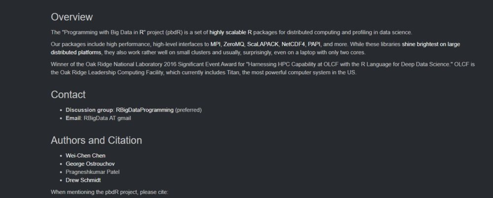 The "Programming with Big Data in R" project (pbdR) is a set of highly scalable R packages for distributed computing and profiling in data science. The "Programming with Big Data in R" project (pbdR) offers packages which includes Application, Communication, Computation, Developers, I/O and Profiling.