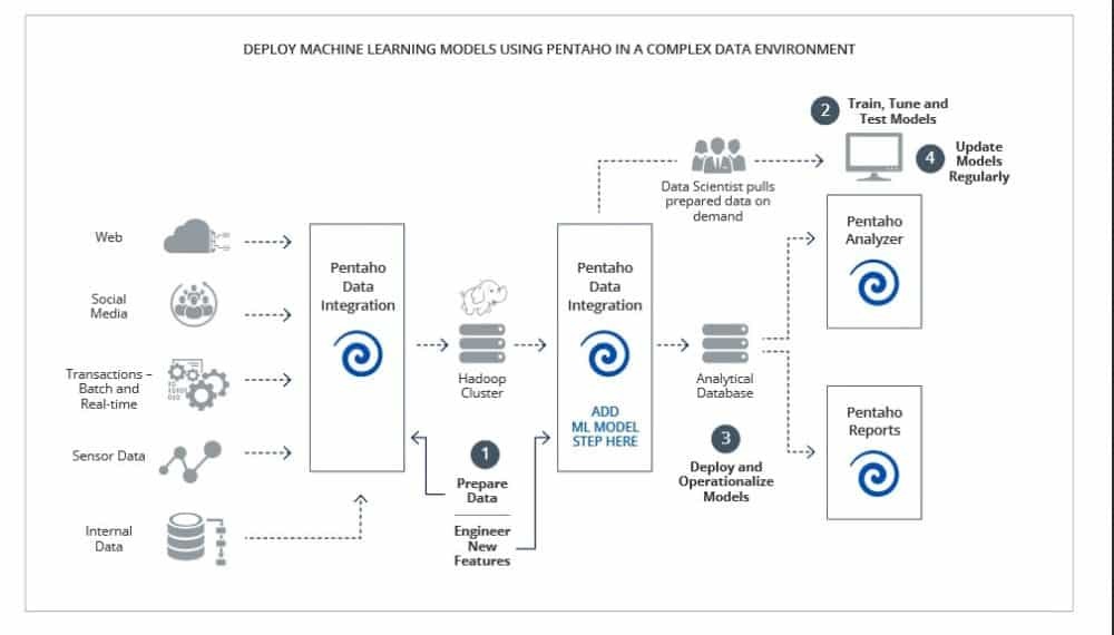 Pentaho orchestration capabilities that streamline the entire machine learning workflow and enable teams of data scientists, engineers and analysts to train, tune, test and deploy predictive models. Pentaho’s Data Integration and analytics platform ends the ‘gridlock’ associated with machine learning by enabling smooth team collaboration, maximizing limited data science resources and putting predictive models to work on big data faster - regardless of use case, industry, or language--whether models were built in R, Python, Scala or Weka.With Pentaho’s machine learning orchestration, the process of building and deploying advanced analytics models maximizes efficiency. Most enterprises struggle to put predictive models to work because data professionals often operate in silos and the workflow - from data preparation to updating models - create bottlenecks. Pentaho’s platform enables collaboration and removes bottlenecks in four key areas: