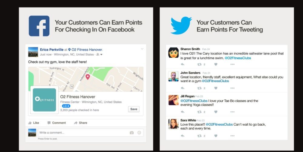• We prompt your customers to earn extra points for sharing their experience on Twitter and checking in on Facebook.