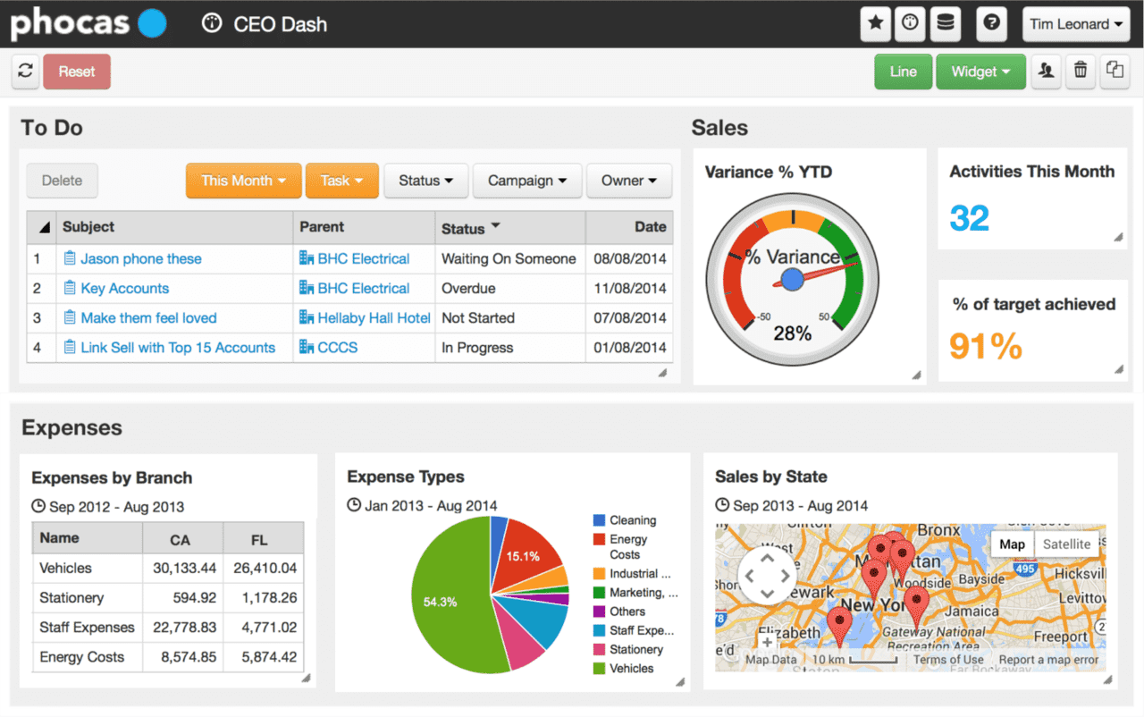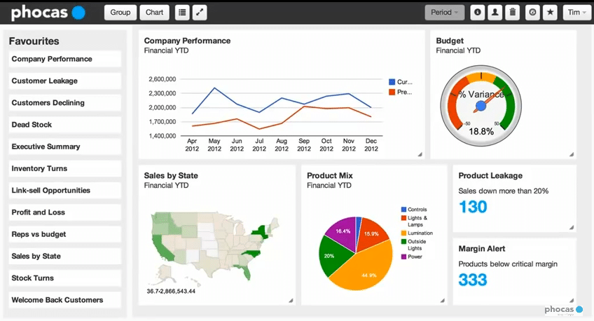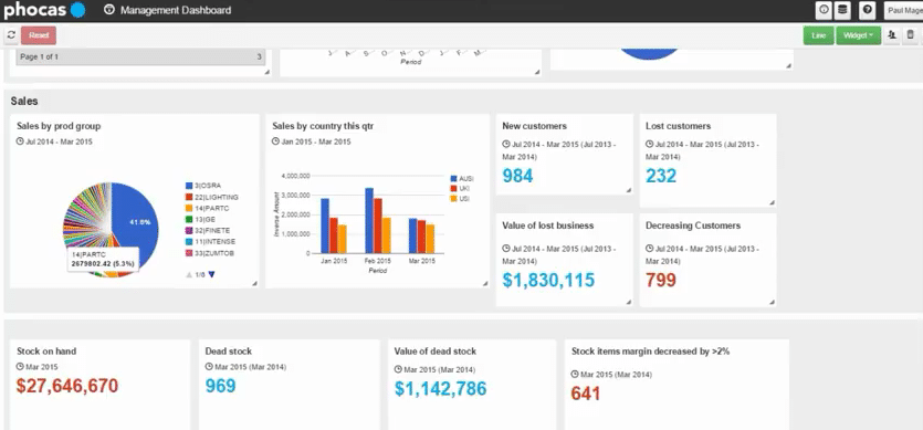 Phocas delivers a simple, powerful analytical capability that quickly turns data into a chart, graph or map at the click of a mouse or touch of a screen. Phocas dashboards gives a stunning visual summary of data, letting to spot check for success and share the results with other users.