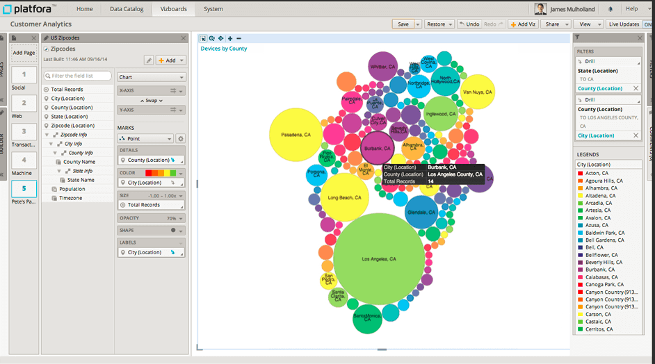 Platfora enables Segmentation, partition groups of connected devices and machines based on patterns of behavior and attributes, and via advanced analysis. Segmentation takes the anonymity of big data sets and makes them manageable and actionable for analysts. Platfora also provides Deep behavioral analysis, the ability to correlate the behavior of devices and data across the extended enterprise to conduct path analyses that reveal system success or failure, and device dependencies. This capability supports new product development, existing product performance analysis and security risk profiling, among other IoT use cases.