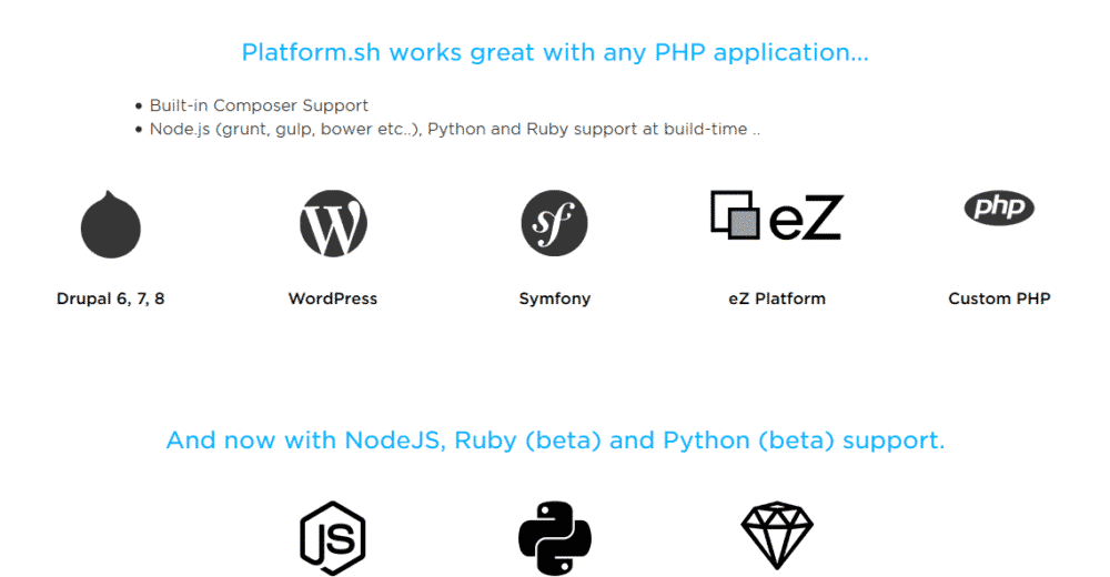 Platform.sh not only gives you a great workflow, incredible stability and dynamic scaling but it is hands-down the fastest hosting platform for Drupal, Symfony and NodeJS projects. Targeting the web application market and foremost large PHP e-commerce sites and media sites Platform.sh has been chosen as the official cloud partner of major open source projects such as Symfony and Drupal Commerce. Platform.sh has also been chosen by major Open Source software vendors and is now powering their SaaS offering through its technology. It has signed exclusive deals with two major European sovereign cloud providers. Platform.sh was built for a buzzing web development process and blazing fast production runtime. No system administration chores. At all. Projects start faster, and get delivered earlier, with better quality through platform.sh. The Platform.sh unique architecture provides enhanced stability and scalability by decoupling dependencies between system components, while code-based configuration and read-only architecture mean that many common attack vectors are simply not available. The result: production sites on Platform.sh are fast, secure and resilient. Platform.sh uses micro-containers to run each system component, such as the web server, a PHP application, a NodeJS or Python one a database, or a search-engine. Running a simple Blog or a simple ecommerce solution is as easy with Platform.sh as running a complex application with multiple backends, written in multiple languages. With a full REST API and a scriptable CLI, Platform.sh can integrate with any external system and workflow. Built-in Github and Bitbucket intergations allow for a perfectly seamless workflow with existing tools. Platform.sh is collaborative and agile. It is incredibly fast on-boarding, developers can get started in minutes contributing to the project with perfect visibility on every feature for project managers and QA.