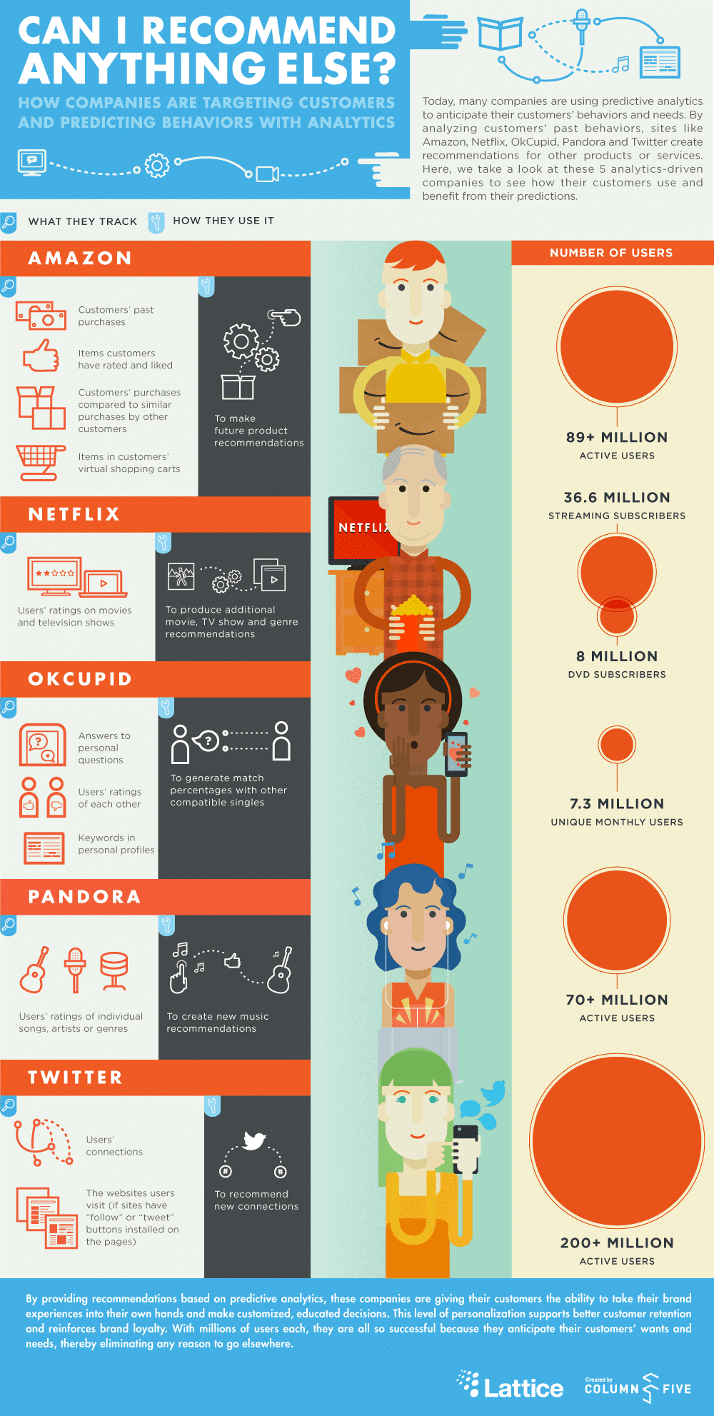 Predicting Behaviors With Analytics: Today's consumer companies like Amazon and Netflix are using the power of predictive analytics to anticipate their customers' behaviors and needs. Check out below the infographic from Lattice Engine.