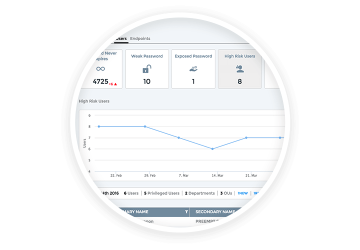 Preempt provides greater visibility into your risky users, endpoints, stale or compromised accounts and privileged user behavior. By monitoring and learning the behavior of every user, group and device on your network including when/where they log in, their role, their system privileges, strength of passwords, and more, you can preempt and identify malicious activity or threats.