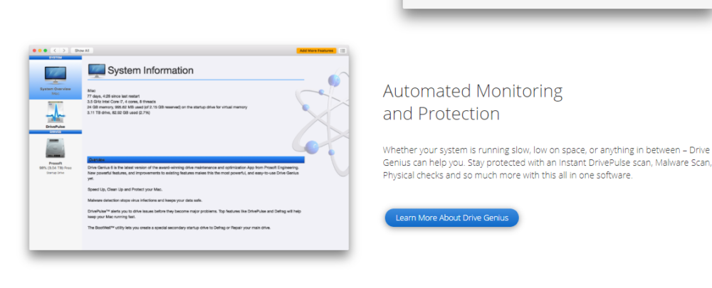 Drive Genius automates the monitoring for the user and gives the total user control over their hard drive. Whether the system is running slow, low on space, or anything in between – Drive Genius can help the user. The solution helps the user stay protected with an Instant DrivePulse scan, Malware Scan, Physical checks, and so much more.