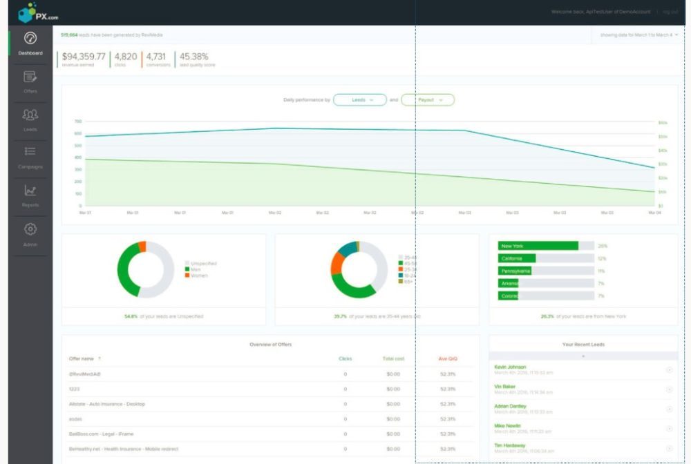PX is a powerful SaaS platform that allows lead buyers and publishers to setup and manage all of their lead gen activities. PX helps from setting up lead gen campaigns to verifying, scoring, and tracking and distributing leads and calls. Imagine an open exchange where publishers and lead buyers can exchange leads, clicks, and calls across all verticals with full transparency that is how PX, Performance Automated works. PX integrates with companies that are invaluable to the lead generation process. The user can access the robust set of features offered by both HasOffers and Invoca without ever leaving their PX dashboard. PX Lead Exchange Platform is scalable, robust, and guarantees 100% transparency. Over the last 5 years, PX experienced "lead genners" have been working hard to develop PX, a fully automated lead-generation solution.