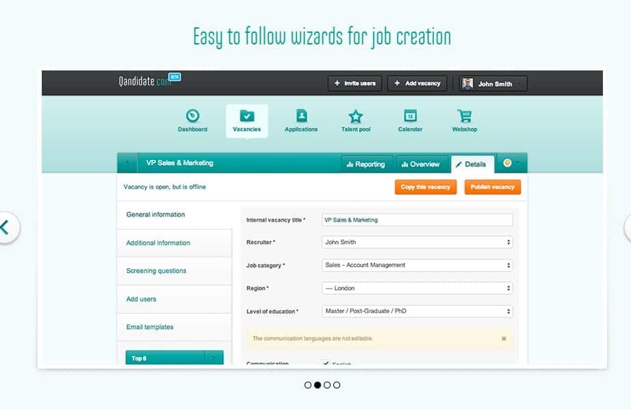 Their is Out-of-the-box career site tool which gets your vacancies online in just a few clicks on your very own career site. This site can be branded to your company branding and is optimized for search engines.Qandidate .com has candidate management tool which controls all applications in one place, no matter where you’re advertising. With filters, candidate reviews, notes and email templates available to you, you are able to create one complete candidate profile in one single place.