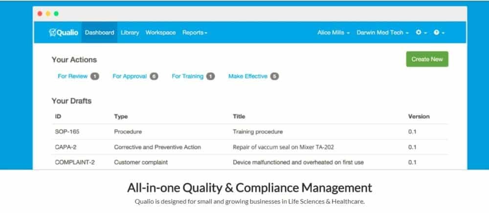 In simplifying quality management, Qualio provides users with a dashboard view that clearly shows them what they need to do; view actions and draft content, and helps them to focus on the right actions at the right time. Qualio also provides an excellent platform for creating procedures, policies, and other controlled content. With this feature, companies also able to set workflows for review, create smart links between documents, and approval and assign trainees.