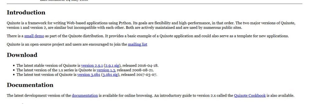 There is a small demo as part of the Quixote distribution. It provides a basic example of a Quixote application and could also serve as a template for new applications. Quixote is an open-source project and users are encouraged to join the mailing list. The latest stable version of Quixote is version 2.9.1 (2.9.1 sig), released 2016-04-18. The latest version of the 1.x series is Quixote is version 1.3, released 2008-08-21.
