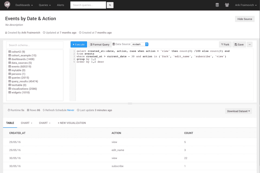 Redash is an open source data collaboration and visualization platform. Redash was built to allow fast and easy access to billions of records. There is a Query Editor in Redash that is like JS Fiddle for SQL queries. This is a way to share data in the organization in an open way, by sharing both the dataset and the query that generated it. This way everyone can peer review not only the resulting dataset but also the process that generated it. Redash comes with an interface to write and run queries on the platform.
