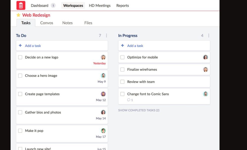 Redbooth can be integrated with various applications that enable teams to perform additional tasks such as sharing files and documents with teammates. These applications include Outlook, Box Enterprise, Zendesk, MS Project and Evernote. Redbooth uses an idea called Workspaces. Workspaces represent projects. Within workspaces, the manager creates a task list.