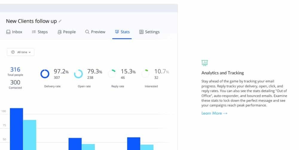 Reach prospects by sending tailored, personalized emails and follow-ups; send an onboarding series to introduce new subscribers to the business, and re-engage inactive subscribers. Analyze results in the All Time statistics view to get the list of prospects filtered by any metric — like Deliveries, Opens, and Replies shown on the People tab of the campaign. Keep an eye on the team performance — Reply has Team analytics to track results throughout the team or by separate members. Get comprehensive statistics on performance metrics like deliveries, opens and clicks for every email in a sequence, along with an insight into the overall performance of the campaign.