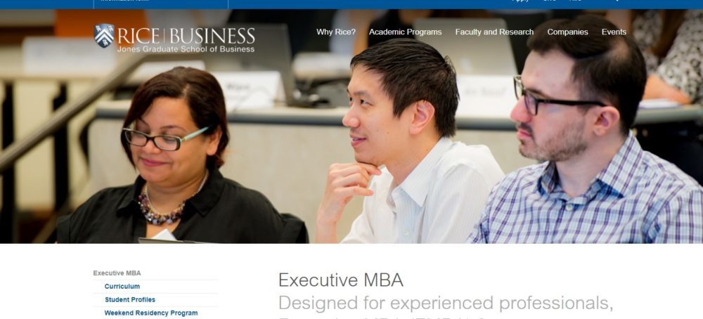 The Executive MBA offered by Rice University’s Jones Graduate School of Business is program that emphasizes on the development of individual leadership, strategy and decision making skills.