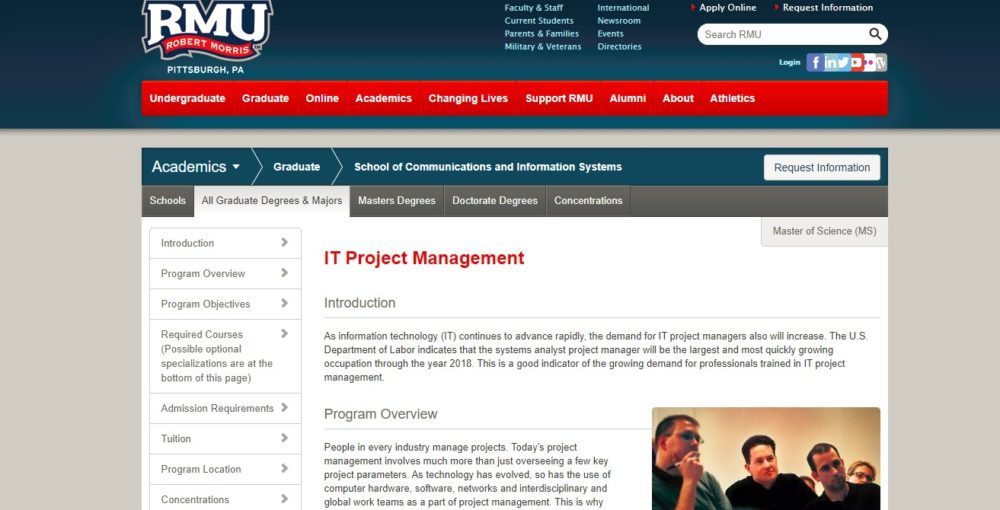 The Master of Science (M.S.) in Information Technology Project Management program offered at Robert Morris University is designed for IT professionals and practitioners who either work in or plan to work in a project-oriented environment. Applicants with an academic background IT are preferred but students who have not completed a specific course in IT may be admitted provisionally, and will be required to complete the course during the first semester of enrollment at RMU. Most undergraduate and graduate programs in project management in the United States focus tightly on issues relating to scheduling and resource management for military and construction industry projects. However, Robert Morris University's M.S. in Information Technology Project Management was the first graduate degree program in the nation to focus specifically on IT project management. The degree will prepare you to apply knowledge and provide leadership in the IT project management environment. It will also empower you to demonstrate an advanced level of intellectual achievement in the context of IT project management. The MS IT Project Management program is also delivered fully online and is identical to the face to face version of the degree. The program offers three concentration tracks so you can personalize your study: General Specialization, Info Systems Specialization, and a Project Management Internship. The internship component allows you to apply what you learn in the classroom to real-world situations and problems. By the time you graduate, you’ll have learnt to synthesize theory and practice of appropriate project management concepts in the design and development of IT projects. You will also be able to utilize project management software to help plan, control, and document the use of the Project Management Institute's Project Management Body of Knowledge (PMBOK) knowledge areas and processes for any type of IT project. Career opportunities for this program are guaranteed because as information technology (IT) continues to advance rapidly, the demand for IT project managers will definitely increase.
