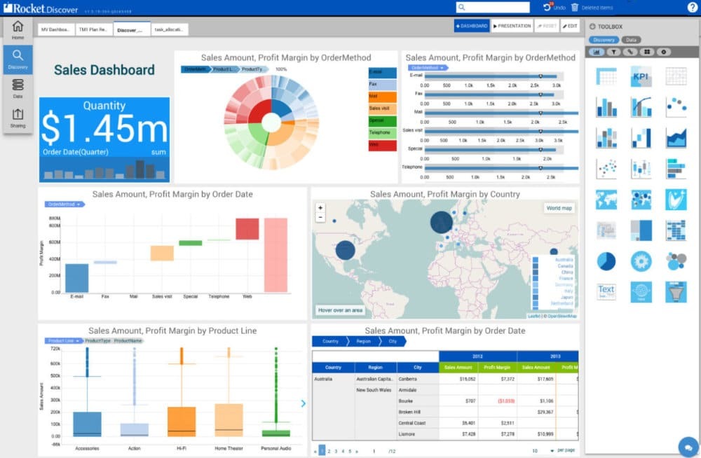Rocket Discover works with a variety of enterprise data sources. With Rocket Discover, users can access and transform existing, disparate data sources into a single result set, essentially creating a virtual data warehouse. The ability to combine views of this data in one dashboard gives the user a comprehensive picture.