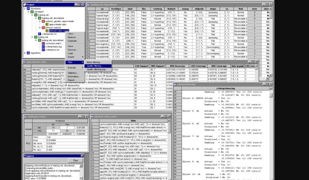 Generation of if-then rules or descriptive patterns via reducts, execution of script files, support for cross-validation; postprocessing – advanced filtering of sets of reducts and rules; validation and analysis – application of synthesized rules to unseen examples, generation of confusion matrices.