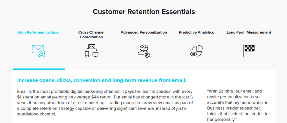 Sailthru Customer Retention Cloud helps modern marketers acquire, grow, and retain customers. Sailthru’s powerful suite of connected capabilities – including high-performance email, onsite personalization, mobile marketing automation, and unique integrations powering new customer acquisition – drives higher revenue, improves customer lifetime value and reduces churn.