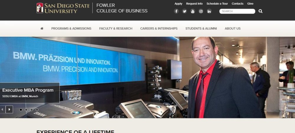 The Fowler College of Business at San Diego University offers an Executive MBA program which enhances your leadership performance and prepares you for positions of greater managerial responsibility. The Fowler EMBA program consists of a talented and diverse body of students who come from different locations and cultures. The program is instructed by an established faculty and inspiring guest speakers who foster a stimulating environment that prepares students to be transformational and inspiring leaders themselves. As a Fowler MBA student, you are bound to acquire business and leadership skills without interrupting your career, explore real issues confronting businesses today through executive level courses, and develop an international business perspective, all learned from a world class faculty. You will also get an opportunity to build an invaluable network of talented and professional associates. Classes meet all-day on Fridays and Saturdays for about for 21months. The program’s curriculum integrates theory and practice, and provides a general management emphasis well-suited to your needs as a mid-career executive. A total of 48 units of coursework are required for the degree. Courses are structured in such a way that subsequent courses build upon the concepts and skills presented in preceding courses. Many course assignments allow you to immediately apply concepts onto situations in your own organization. First year courses help you develop a solid foundation in traditional business disciplines and introduce you to core business principles. Coursework in the second year creates an awareness of the environment in which business operates and provides a comprehensive understanding of organizations as well as strategic context for business decision making. The program also features an International Study program which allows students to gain an understanding of global business practices and acquire direct international experience in foreign countries.