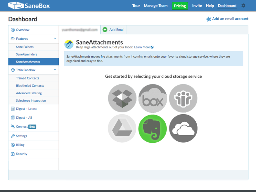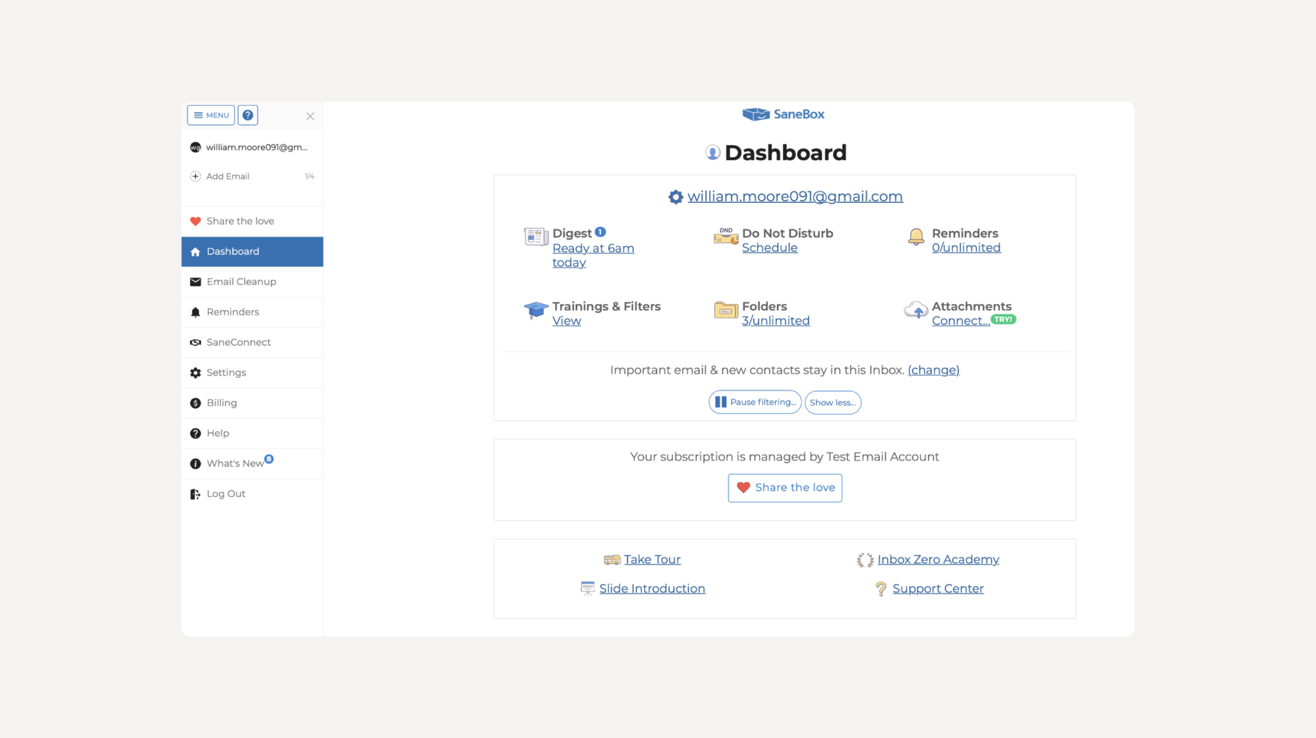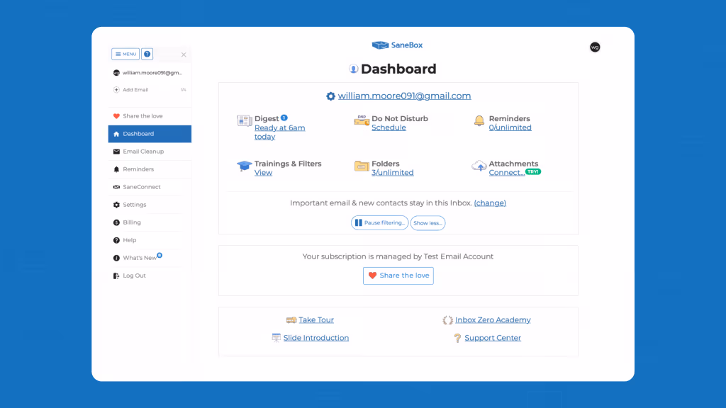 - The SaneBox dashboard for configuration (feature toggles, settings)