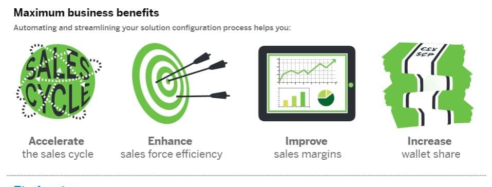 SAP CPQ features a comprehensive, scalable configuration engine, which helps cut through complexity and quickly design multifaceted solutions from the bottom up, improving CPQ efficiency. Its intuitive interface and configuration tools, let you analyze functional specifications, define component requirements, resolve interdependencies as well as bundle multiple solution components such as hardware, software, and services into one custom offering.