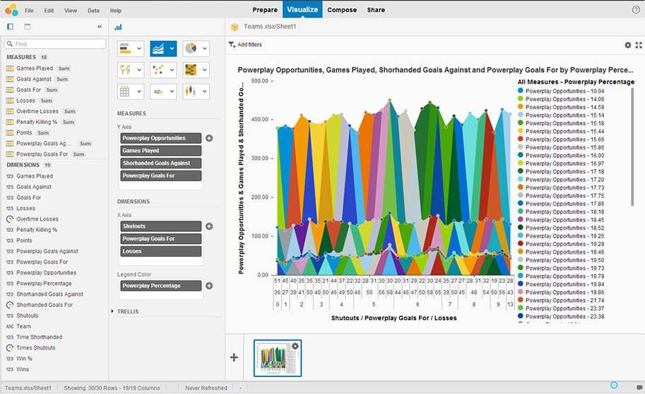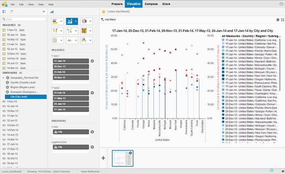 SAP Lumira – data visualization software that makes it easy to create beautiful and interactive maps, charts, and infographics. Import data from Excel and many other sources, perform visual BI analysis using intuitive dashboards, and securely share insights and data stories with your team.