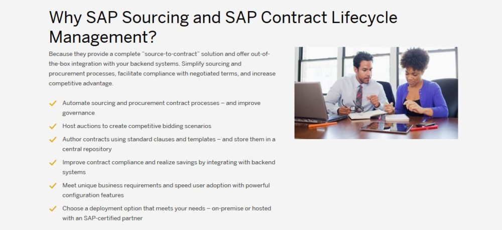 Gain tighter control over strategic sourcing and contract management activities – and maximize savings.Why sap? Because they provide a complete “source-to-contract” solution and offer out-of-the-box integration with the backend systems. Simplify sourcing and procurement processes, facilitate compliance with negotiated terms, and increase competitive advantage like : Automate sourcing and procurement contract processes – and improve governance,Host auctions to create competitive bidding scenarios,Author contracts using standard clauses and templates – and store them in a central repository,Improve contract compliance and realize savings by integrating with backend systems,Meet unique business requirements and speed user adoption with powerful configuration features.