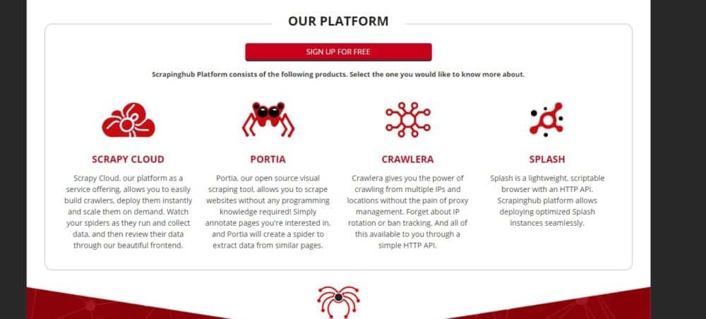 ScrapingHub Platform is a leading service known for building, deploying and running web crawlers, providing up-to-date data along the way. Collated data are displayed in an amazing stylized interface where they can be reviewed with ease. ScrapingHub platform provides an open source platform called Portia a program designed for Scraping websites. It requires zero programming knowledge; templates are created by clicking on elements on the page you would like to scrape, and Portia will handle the rest.