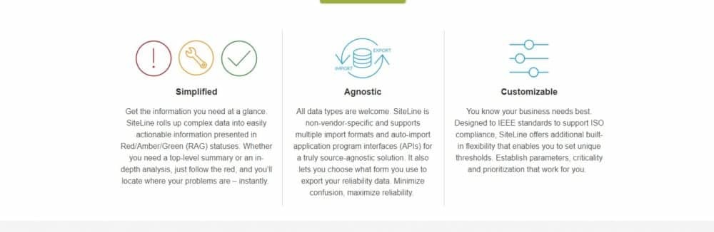 SiteLine is simplified: it provides information at a glance by rolling up complex data into the easily actionable information presented in Red/Amber/Green (RAG) statuses for a top-level summary or in-depth analysis, and it simplifies asset condition monitoring by making information accessible from anywhere. SiteLine is agnostic as it supports all data types, multiple import formats, auto-import application program interfaces (APIs), and it provides a choice of what form to export reliability data.