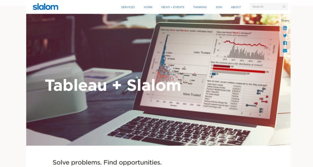 Recognizing that numbers alone don’t tell the full story, Tableau Software created a tool to help anyone and everyone see and understand their data. Elegant, interactive data visualizations enable people to answer questions as they arise, and then share those insights with the click of a button. Slalom has been recognized as Tableau's North and South America Alliance Partner of the Year for four years.