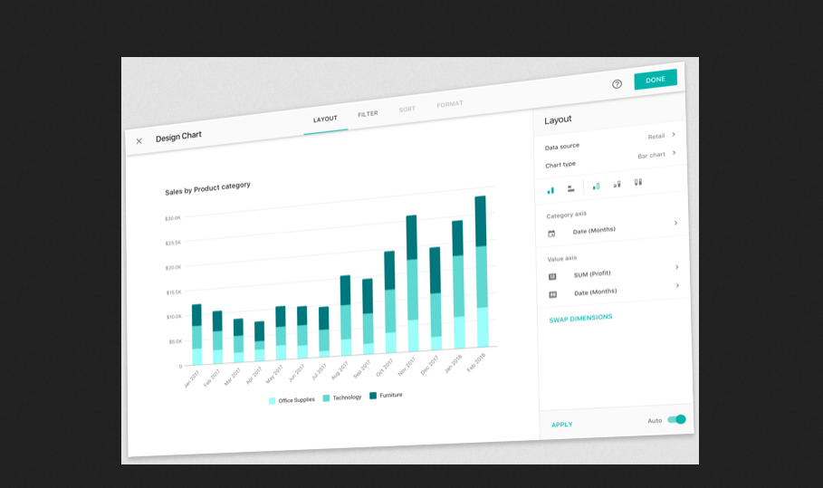 Slemma is a collaborative business analytics app with numerous dashboard options and chart designer, the dashboards are made to fit your mould they range from QuickBooks to Google analytics dashboard among others. The dashboards can be viewed on any devise for easy presentation. Slemma chart designer helps build customised reports.