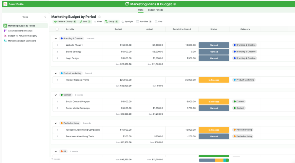 SmartSuite leans into a Grid View experience that feels spreadsheet-like (sort, filter, group, inline edits). This matters because adoption friction often comes from unfamiliar interaction patterns. A grid metaphor lowers the barrier for teams graduating from spreadsheets.